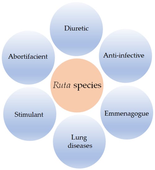 - Coimbra, A.T.; Ferreira, S.; Duarte, A.P. Genus Ruta: A natural source of high value products with biological and pharmacological properties. J. Ethnopharmacol. 2020, 260, 113076. [Google Scholar] [CrossRef]