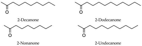- Krayni, H.; Fakhfakh, N.; Kossentini, M.; Zouari, S. Fruits of Ruta chalepensis L. (Rutaceae) as a source of 2-undecanone. J. Essent. Oil Bear. Plants 2018, 21, 789–795. [Google Scholar] [CrossRef]