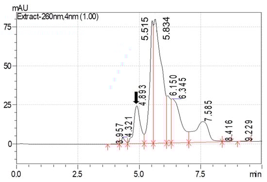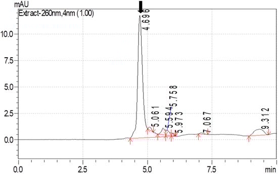 Amitraz was detected at a wavelength of 260 nm. The calibration curve for amitraz, prepared using linear regression analysis, fitted well over the range of 10–100 µg/mL with a regression coefficient (R2) of 0.986. The regression formula obtained from the calibration curve was further used to quantify the concentration of amitraz in analyzed samples. The limit of detection (LOD) and limit of quantification (LOQ) for amitraz were 0.40 µg/mL and 1.35 µg/mL, respectively. The detection limit was evaluated by the peak signal/noise (S/N) ratio. An S/N greater than 3 was considered a detectable peak. Maximum recovery of amitraz was observed after fortifying blood and milk with 10, 50, and 100 µg/mL of amitraz with methanol as the extraction solvent (>85% recovery for blood and >95% recovery for milk). The chromatogram for amitraz recovered from the blood and milk, following fortification with a known quantity, is depicted in Figure 1 and Figure 2.