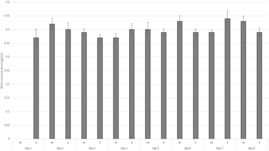 Plot of the mean concentration of amitraz in milk collected twice daily in the morning and evening up to eight days after single dermal administration (n = 6, mean ± SE values; M = morning, E = evening).