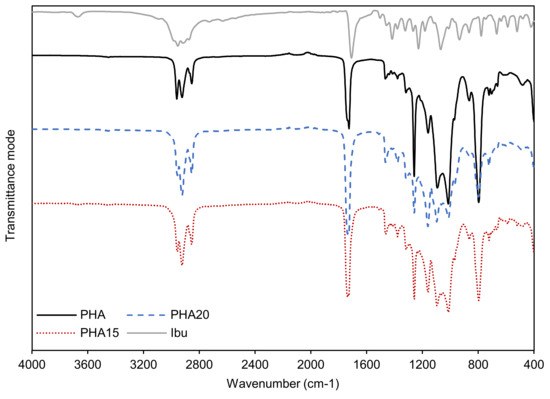 ATR-FTIR spectra of mcl-PHA original sample (PHA, black full line) compared to the mcl-PHA sample impregnated with ibuprofen at 20 MPa (PHA20, blue dashed line) and the sample impregnated at 15 MPa (PHA15, red dotted line). The spectrum for ibuprofen (Ibu, grey full line) is also represented. The spectra were obtained in the region of 4000 to 400 cm−1, in transmittance mode.