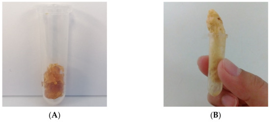The sorption of scCO2 into the biopolymer matrix upon depressurization is clear and evidenced by its expansion (Figure 3B) compared to the original mcl-PHA sample (Figure 3A). This shows that exposure to the scCO2 treatment causes foaming of the biopolymer matrix, increasing its porosity and changing its morphology. The original mcl-PHA sample presented a glue-like behavior, associated to its highly amorphous structure (Xc = 27% and Tg = −50 °C) [19,28], which usually corresponds to a higher affinity towards CO2 than polymers with higher crystallinity degrees or high Tg values [40]. Sorption of CO2 into the polymeric matrix can cause swelling and plasticization, characterized by the reduction of the Tg, as well as decrease of viscosity and improvement of the dispersion of additives through the biopolymer matrix during impregnation [5]. ScCO2 swelling and plasticization also increase the mobility of the polymer’s chains, hence turning glassy polymers into rubbery matrixes which allows for the generation of porous structures [39,41]. CO2 is also able to interact with polymers’ ester groups, hence causing enhanced mobility of the polymeric chains [5].
