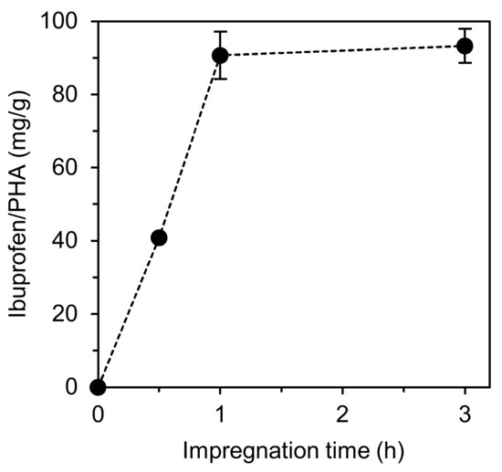 By plotting the maximum ibuprofen concentration against the corresponding impregnation time for the experiments conducted at 20 MPa, it was possible to determine the ibuprofen-impregnation rate into the mcl-PHA at that fixed pressure, which was determined as 89 mg/(g·h) (Figure 4). Here, it is also possible to observe that the maximum amount of ibuprofen that the PHA is capable of accommodating is achieved after only 1 h. If compared with the impregnation of ibuprofen on alginates, for instance, the maximum ibuprofen concentration (148 mg/gAlginate) was only achieved after 3 h of impregnation [2], representing a much slower impregnation rate than the one obtained in this work.