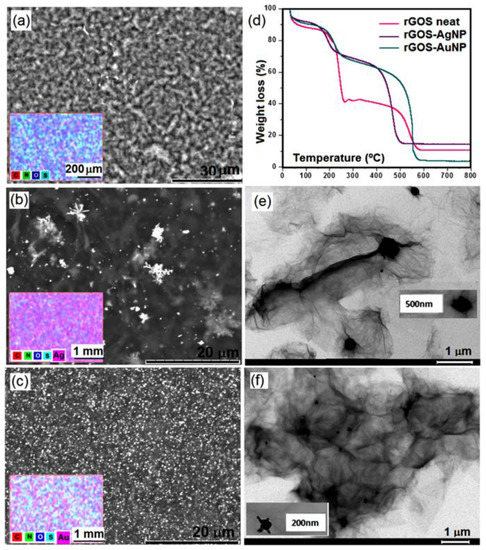 Characteristics of rGOS-AgNP and rGOS-AuNP hybrid films: (a) SEM image of neat rGOS, inset: EDX map of the same film; (b) SEM image of rGOS-AgNP film, inset: EDX map of the same film; (c) SEM image of rGOS-AuNP film, inset: EDX map of the same film; (d) TGA curves of hybrid films; (e) TEM image of rGOS-AgNP film; (f) TEM image of rGOS-AuNP film. In the insets of (e,f) single Ag and Au nanoparticle is shown, respectively.