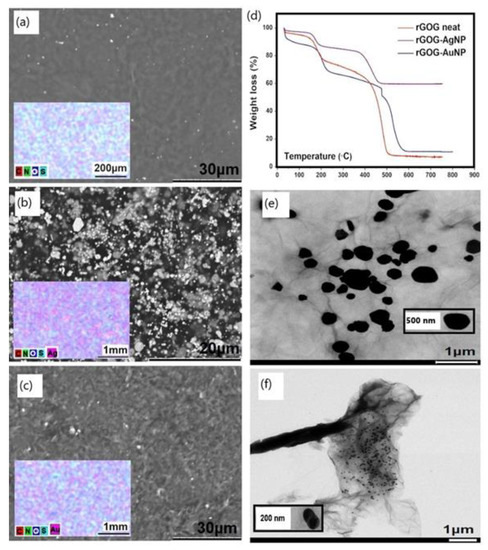 It is worth noting that the quality of graphene affects not only the distribution and aggregation of the nanoparticles formed on its surface, but also their morphology, probably due to the simultaneous reduction process of both graphene and the precursors. TEM images in Figure 3e present that AgNP forms large aggregates (200–800 nm) with a large distance between them, which means that the possibility for electromagnetic coupling between neighboring nanoparticles is rather low. Figure 1f reveals decreased particle size of AuNPs, which are packed closely onto some of the areas of the rGOG nanoplatelets. Finally, according to TGA results shown in Figure 3d, both nanocomposites presented important difference in the weight loss curves, which demonstrates presence of structural and compositional difference. The thermal degradation behavior is similar to the rGOS-based composites, thus three clear weight loss regions are observed. However, rGOG-AuNP shows similar behavior as the neat rGOG, indicating that the interaction between the AuNPs with the rGOG is not strong. There is very low amount of residuals after the TGA analysis, indicating low amount of AuNPs (according to Table S1, it is 7.3%), not strongly attached to rGOG. In case of rGOG-AgNP nanocomposite, significantly less oxygen functionalities were lost, accounting for better interaction of AgNP with rGOG with respect to AuNP and with respect to rGOS composites. The fact that rGOG is characterized by higher aspect ratios and lower thickness than rGOS means that at the same quantity, rGOG offers larger surface area, thus, lower coverage with nanoparticles is likely achieved than in case of rGOS. However, a very high amount of residual (~60%) indicates that AgNP were very strongly attached to the rGOG.