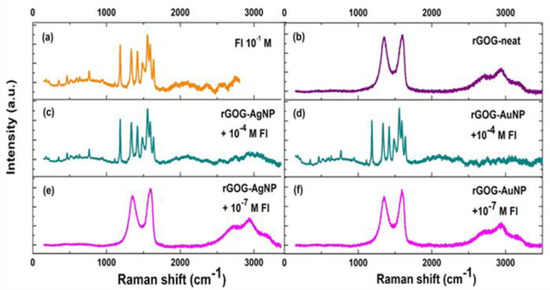 Raman spectra of Fl deposited in different concentration over the respective film: (a) Fl deposited from 10−1 M solution over a glass substrate; (b) neat rGOG film; (c) Fl deposited from 10−4 M solution over a rGOG-AgNP film; (d) Fl deposited from 10−4 M solution over a rGOG-AuNP film; (e) Fl deposited from 10−7 M solution over a rGOG-AgNP film; (f) Fl deposited from 10−7 M solution over a rGOG-AuNP film.