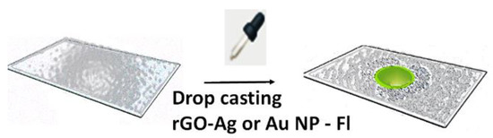 For synthesis of the hybrid SERS substrates, first aqueous dispersions were prepared by mixing GO and silver nitrate precursors for Ag nanoparticles (NP) and gold (III) chloride hydrate precursor for AuNP, according to the following procedure. About 50 mL GO aqueous dispersion was sonicated (Hielscher Sonicator-UIS250v, (Hielscher Ultrasonics GmbH, Teltow, Germany) with an amplitude of 70% and energy pulsed at 0.5 Hz at room temperature for 10 min in a 100 mL beaker under continuous agitation of 200 rpm, followed by addition of polyvinylpyrrolidone (PVP) solution (5 mg of PVP in 5 mL water). PVP with molar mass of 10,000 Da was added to assure colloidal stability in the aqueous dispersions during the reduction process. In this dispersion, 60 mL of the respective precursor in aqueous solution was added (60 mg precursor in 2 mL of water). After mixing, the reduction process was performed by ascorbic acid (AsA) reducing agent in concentration of 560 mg in 3 mL water, at room temperature for 72 h. AsA reduced simultaneously the GO and the respective precursor facilitating the growth of the nanoparticles in the dispersions that strongly adsorbed onto the rGO platelets. As a result, hybrid rGO nanoplatelets decorated with AgNP and AuNP were obtained, denoted as: rGOS-AgNP, rGOS-AuNP, rGOG-AgNP, and rGOG-AuNPs according to type of graphene and type of nanoparticles. Total of 4 μL of each of these dispersions was drop casted over glass rectangular substrates and left for drying at standard atmospheric conditions (20 °C and 55% relative humidity, Scheme 1).