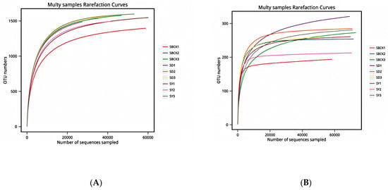 Bacterial (A) and fungal (B) rarefaction curves from different soil samples (SBCK: conventional control treatment with no biochar; SD: rice straw biochar; SY: corn straw biochar). Note: OUT: operational taxonomic units.