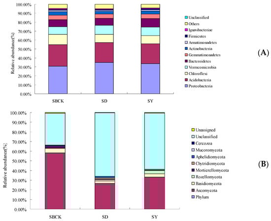 Previous studies have indicated that biochar amendment differs in its effects on bacterial and fungal diversity. For example, Shuailin Li et al. (2020) reported that bacterial and fungal alpha diversity hardly changed after two years of addition of biochar alone or combined with N fertilizer. Hu et al. (2014) reported that bacterial diversity increased but fungal diversity decreased with short-term biochar addition in a red oxidized loam soil [35]. In this study, biochar had no significant effect on bacterial community diversity. The SD increased fungal community diversity, but SY decreased fungal community diversity. The Shannon index of fungi treated with SD was increased by 3.84% compared to SBCK. However, the Shannon index of fungi in SY was decreased by 6.99% compared to SBCK. This may be due to the fact that the diversity of microorganisms is jointly determined by species richness and evenness, and this may vary owing to the proportion of richness and evenness [36].