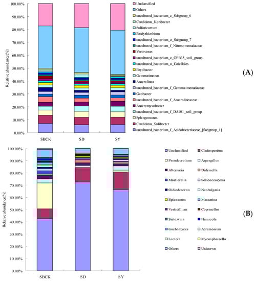 Figure 3 presents the bar chart for soil bacteria and fungi at the level of genus classification. As presented in Figure 3A, at the genus level of soil bacteria biochar increased the relative abundance of Sphingomonas, uncultured_bacterium_f_DA101_soil_group, Geobacter, and uncultured_bacterium_f_Gemmatimonadaceae. However, the relative abundances of uncultured_bacterium_f_Acidobacteriaceae_[Subgroup_1], Candidatus_Solibacter, Anaeromyxobacter, uncultured_bacterium_f_Anaerolineaceae, Anaerolinea, and Gemmatimonas were decreased. Bradyrhizobium is widely regarded as a nitrogen-fixing and denitrification bacterium and participates in the nitrogen cycle [51]. In this study, the effect of different kinds of biochar on Bradyrhizobium was inconsistent. The corn stalk biochar (SY) increased the abundance of Bradyrhizobium and rice stalk biochar (SD) decreased. However, the effect of biochar on other PGPR was not detected. The biochar not only improves the physicochemical properties of the soil but also serves as carrier material for PGPR inoculation [9,52], and biochar provides a safer environment against various biological competitors in soil due to porous structure [53,54]. Further research is needed to confirm the biochar with PGPR efficacy in the long-term with respect to albic soil conditions.