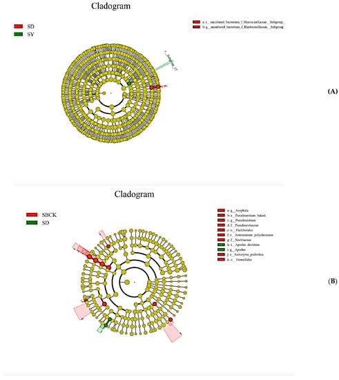 Significance analysis of inter-group differences revealed that when an LDA value of >4 was set, there were few markers with significant differences between different groups of samples. When an LDA value of >3 was set, the significant difference markers in soil bacteria were enriched in the SD and SY treatments, and the significant difference markers in SD and SY were 3, while that of SBCK was 0. Significant difference markers in soil fungi were enriched in SBCK and SD treatments, of which nine markers were found for SBCK and two markers were found for SD. This demonstrates that biochar affects the composition of bacteria and fungi within the soil (Figure 4).