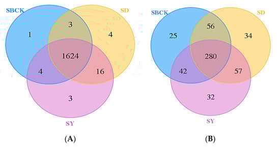Venn diagrams can reflect the number of common and unique OTUs between groups or samples and can intuitively indicate the overlap of OTUs between groups or samples [61]. Apple biochar at 0.5%–4% dosage could significantly increase the number of unique bacteria OTUs and affect the bacteria groups [62], while the number of unique bacterial OTU was one to three times the common OTU numbers, but they had no significant effect on the fungal groups [48]. As presented in Figure 5A, the number of common bacterial OTUs among different treatments was 1624, the number of unique bacterial OTUs without biochar application (SBCK) was 1, and the numbers of unique bacterial OTUs in biochar treatment of SD and SY were 4 and 3, respectively. The number of common fungal OTUs among the different treatments was 280, the number of unique fungal OTUs in the absence of biochar (SBCK) was 25, and the numbers of unique fungal OTUs in the biochar treatment of SD and SY were 34 and 32, respectively (Figure 5B). This indicates that biochar can increase the number of unique OTUs of bacteria and fungi in soil and can alter the composition of bacteria and fungi groups. This is due to the ability of biochar to affect soil physical and chemical properties and biological characteristics to thus create a specific microenvironment for microorganisms [63].