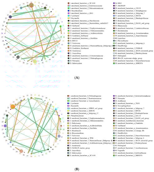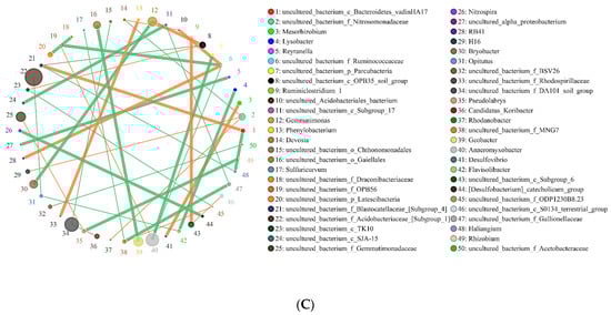 In this study, the co-expression analysis based on Python plotting revealed the top 50 different genera with the highest correlation, and these are presented in Figure 6 and Figure 7. The horizontal correlation network diagram of genera revealed that there is significant interaction between different genera (the orange line represents positive correlation, the green line represents negative correlation, the thickness of the line represents the magnitude of the correlation coefficient, and the number of lines represents the close degree of connection between nodes). Figure 6 shows that in the interaction network of major soil bacteria genera, the high relative abundance microorganisms of SBCK were Candidatus_Solibacter, Uncultured_Bacterium_F_Anaerolineaceae, and Uncultured_Bacterium_F_Da101_Soil_Group. The groups with higher relative abundance in SD were uncultured_Bacterium_F_Acidobacteriaceae_ [Subgroup_1] and Uncultured_Bacterium_F_Da101_Soil_Group. Those with high relative abundance in SY were Uncultured_Bacterium_F_Acidobacteriaceae_[Subgroup_1], Uncultured_Bacterium_F_Da101_Soil_Group and Anaeromyxobacte R. The degrees of correlation among the bacterial genera were different. Among the SBCK, 38 were negatively correlated, and 29 were positively correlated. Among the SD treatments, 48 were negatively correlated, and 34 were positively correlated. In the SY treatment group, 48 were negatively correlated, and 31 were positively correlated. It can be observed that the correlation of major soil bacteria genera in the biochar treatment group is stronger than SBCK, and the number of positive correlations (orange) in the biochar treatment group was higher than SBCK.