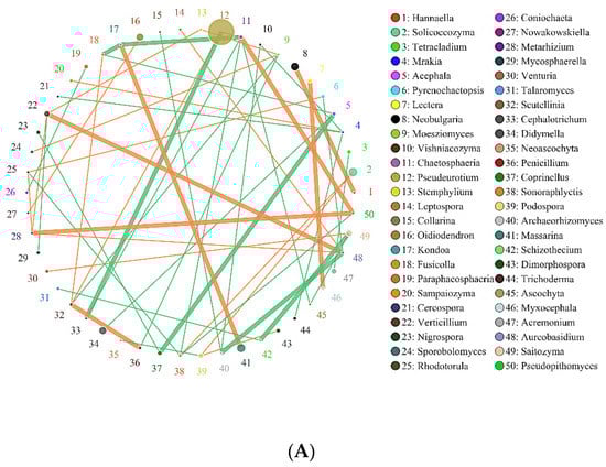 As presented in Figure 7, in the interaction network of major soil fungi genera, Pseudeurotium exhibited the highest relative abundance in SBCK, while Cladosporium, Aspergillus, and Alternaria exhibited the highest relative abundance in SD. The high relative abundances in SY were Pseudeurotium, Didymella, Alternaria, and Solicoccozyma. The degrees of correlation among the fungal genera were different. Among SBCK, 39 fungal genera were negatively correlated, and 30 fungal genera were positively correlated. There were 47 negative correlations and 41 positive correlations among SD treatments. In the SY treatment group, 43 exhibited a negative correlation, and 35 possessed a positive correlation. It can be observed that the correlation of soil fungal genera in the biochar treatment group was stronger than SBCK, and the number of positive correlations (orange) in the biochar treatment group was significantly higher than that in the SBCK group. Biochar increases the interaction level between microorganisms, and this may affect the complexity of the network structure. This indicates that biochar application can not only alter the microbial community structure but also change the overall microbial interaction.
