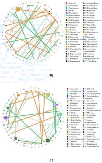 Network of interactions of the main fungi genus in soil. Note: (A) SBCK (conventional control treatment with no biochar); (B)SD: (rice straw biochar); (C) SY: (corn straw biochar).
