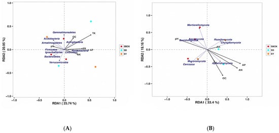 RDA analysis of the effects of soil nutrients on changes in bacterial community (A) and fungal community (B) structure. Note: SBCK (conventional control treatment with no biochar); SD (rice straw biochar); SY: (corn straw biochar); TK: total potassium; OC: organic matter content; AN: available nitrogen; AP: available phosphorus; AK: available potassium.
