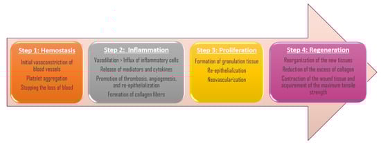The wound-healing process has the purpose of recovering the integrity of the damaged tissue and the regeneration of the epithelium that was lost, and it is a dynamic and complex process that globally occurs in four overlapping steps: hemostasis, inflammation, tissue proliferation, and regeneration [1,2] (Figure 1).