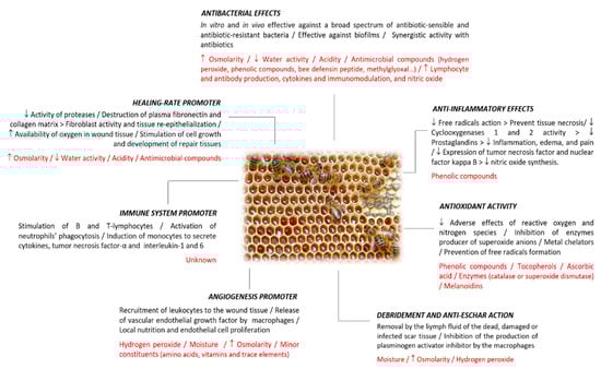 Honey is a natural and greatly complex substance with hundreds of compounds in its composition [8]. Honey bioactivity, and in consequence, its wound-healing potential, will be influenced by its composition, which depends mainly on the floral source and other factors, such as seasonal, environmental, as well as processing, manipulation, packaging, and storage conditions [25,26]. In addition to some inherent characteristics, such as the acidity and the osmotic pressure, the healing properties of honey in diverse types of wounds and burns have also been attributed to other components which act through different mechanisms that work together to restore the structural integrity of the damaged tissues [6,18,27] (Figure 2).