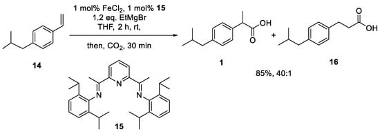 The construction of a 2-arylpropionic acid skeleton inspired hydrocarboxylation, which is crucial for ibuprofen or naproxen synthesis [26]. Iron-catalyzed hydrocarboxylation, as reported by Thomas et al., is shown in Scheme 4 [27]. Although hydrocarboxylation of styrene was expected to introduce the ibuprofen skeleton, the regioselectivity hampered it [28]. However, the highly selective addition of CO2 was possible by employing an iron catalyst and pyridine ligand 15. The following mechanistic study showed that the transmetallation and hydrometallation of iron and styrene moieties are important for regioselective addition.