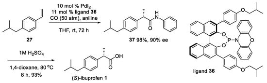 Although ibuprofen has been commercialized as a racemic mixture, enantiomerically pure (S)-ibuprofen has better efficacy and potency. In line with this merit, synthesis of (S)-ibuprofen has been studied extensively. Scheme 15 is a good example of this endeavor. Incorporation of CO and aniline into the styrene 27 was accomplished enantiomerically pure manner [53]. It features asymmetric Markovnikov-type hydroaminocarbonylation of styrene with catalysis of Pd and phosphoramidite ligand 36. Although this type of addition reaction has been reported, it is impressive that this reaction can be achieved at room temperature, with high regioselectivity (branched:linear = 99:1) and stereoselectivity (90% ee).
