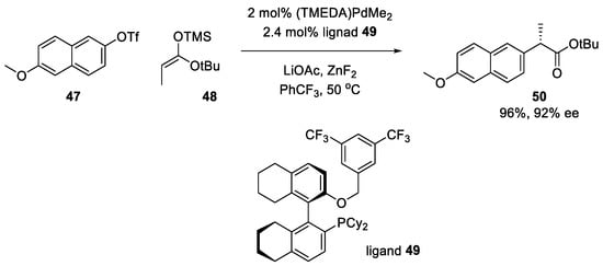 A similar approach was studied using Pd-mediated alkylation of silyl ketene acetal, as shown in Scheme 19 [73]. For this conversion, aryl triflate was used as the coupling reagent with a simple ketene acetal 48 in the presence of a Pd catalyst. More importantly, a chiral ligand 49 dominantly directs facial selectivity to produce the (S)-arylpropionic acid framework 50 [74]. This strategy also showed that other NSAIDs, such as (S)-fenoprofen, (S)-flurbiprofen, and (S)-ketoprofen, could be obtained in good chemical yield and stereoselectivity (>90% yield, >88% ee).