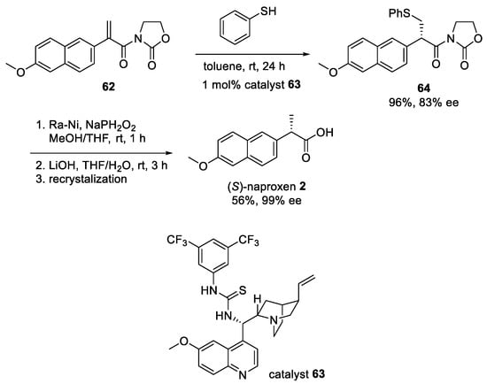 The asymmetric addition of thiophenol was also attempted, as shown in Scheme 23 [87]. The α,β-unsaturated terminal alkene 62 was treated with thiophenol to produce a Michael adduct 64. This conversion proceeded asymmetrically with the influence of cinchona-derived catalyst 63. Raney-Ni and NaPH2O2 were treated to cleave the carbon-sulfur bond in the next step. Finally, hydrolysis and recrystallization afforded enantiomerically pure (S)-naproxen in good yields. Employing this strategy, (S)-ibuprofen could also be obtained with a similar yield and enantiomeric purity. Thus, the author proposed that thiourea as a chiral catalyst could interact with the dicarbonyl groups in the substrate via hydrogen bonding, serving as a chiral platform for the asymmetric Michael addition of thiophenol.