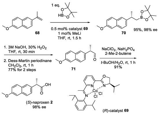 Another asymmetric hydroboration route to (S)-naproxen was developed in 2014 [92]. The terminal alkene 68 was chosen for pivotal hydroboration to use a more versatile substrate. Remarkably, cobalt catalyst 69 was prepared for this conversion after an extensive screening of the catalyst and reaction conditions. After the desired pinacolatoboron 70 was obtained exclusively, it was oxidized to (S)-naproxen via a three-step sequence without any epimerization. The overall yield was 66% from the starting alkene 68, as shown in Scheme 25. Hence, considering the easy preparation of chiral catalysts and their low loading, this reaction could be considered for the large-scale synthesis of other NSAIDs if cobalt can be treated in an environmentally friendly manner.