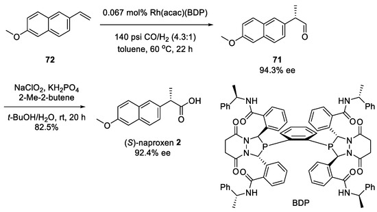 Hydroformylation in flow reactions has also been studied for industrial purposes [93,94,95]. Researchers at the University of Wisconsin-Madison and Eli Lilly Corporate Center published a paper on the asymmetric synthesis of (S)-naproxen using rhodium-catalyzed hydroformylation, as shown in Scheme 26 [96]. In this paper, gas and liquid reagents were mixed in a flow reactor. After a systematic survey of the reactor design and chiral ligands, (S)-naproxen was produced in two steps in over 80% yield and 92% enantiomeric excess from the simple vinyl substrate 72. As this reaction is designed to work in a continuous-flow reactor system, its use for the industrial synthesis of (S)-naproxen is also possible [97].