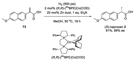Asymmetric hydrogenation is a valuable methodology for chiral medicine synthesis [98,99,100]. For NSAID synthesis, the chiral ferrocene-ruthenium complex was reported to be promising, as shown in Scheme 27 in 2016 [101]. This reduction process was developed for NSAID synthesis and other chiral propionic acid skeletons, such as artemisinin. In some examples, catalyst loading could be reduced to 0.02 mol%; therefore, further development and wide applications are promising. Moreover, (S)-naproxen and (S)-ibuprofen were obtained in over 97% chemical yield and over 97% enantiomeric purity.