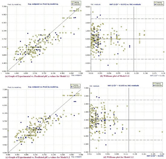(a) Graph of experimental vs. predicted pIC50 values for model 1.1; (b) Williams plot for model 1.1; (c) graph of experimental vs. predicted pIC50 values for model 1.2; (d) Williams plot for model 1.2.