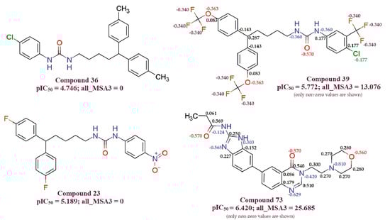 all_MSA3 (Molecular Surface Area of all atoms having partial charge in the range of 0.099 to 0.000): The observation is supported by comparing compound 36 (IC50 = 4.746) with compound 39 (pIC50 = 5.772), for which an increase in the value of all_MSA3 from 0 for compound 36 to 13.07 for compound 39 results in an increase in pIC50 value by about 1 unit (about ten-fold increase in MDA-MB-231 cell anti-proliferative activity). Compound 23 (all_MSA3 = 0; pIC50 = 5.189) and compound 73 (all_MSA3 = 25.69; pIC50 = 6.420) is another pair used as an example to support this observation. Partial charges on each atom of the compound with the non-zero value of the all_MSA3 descriptor are shown explicitly in Figure 2. The descriptor all_MSA3 to calculate molecular surface area takes into consideration atoms with partial charges in the range −0.099 to 0.000 only.