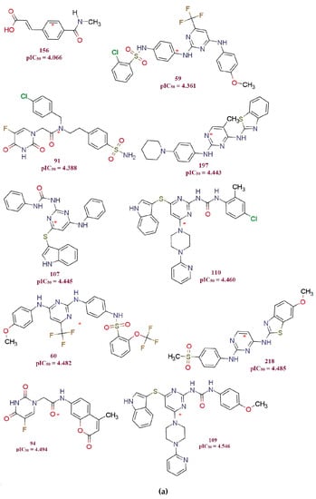 Variations in activity and chemical structures in the present dataset of MDA-MB-231 anti-prolifertives: (a) ten least active compounds; (b) ten most active compounds from the present series. Asterisks * mark denotes the position of the center of the mass of the molecules.