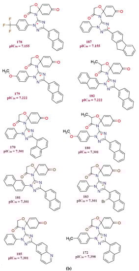 A total of 219 MDA-MB-231 cell antagonists having moderate anti-proliferation potency (experimental IC50 = 0.04 to 86 μM) have been selected for the present work [8,9,10,11,12,14,15,16,17,18,19,20]. The IC50 values were converted to pIC50 (pIC50 = –logIC50) before actual QSAR analysis. To demonstrate the variation in bioactivity with chemical features covered by the present dataset, ten least and ten most active molecules have been depicted in Figure 3a,b. The SMILES strings with reported IC50 and pIC50 values for all the molecules are present in Table S4 in the supplementary material.
