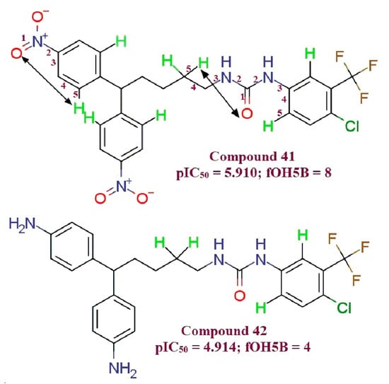 fOH5B (Frequency of occurrence of number of hydrogen atoms, which are present exactly at 5 bonds from Oxygen atom): In compound 42 (fOH5B = 4; pIC50 = 4.914) there are four hydrogen atoms which are five bonds away from oxygen. Whereas, in ten-fold more potent MDA-MB-231 anti-proliferative compound 41 (fOH5B = 8, pIC50 = 5.910), eight such hydrogens are present. This illustrates the significance of the higher value of the fOH5B molecular descriptor in order for leads to be better MBA-MD-231 anti-proliferative agents (Figure 5).