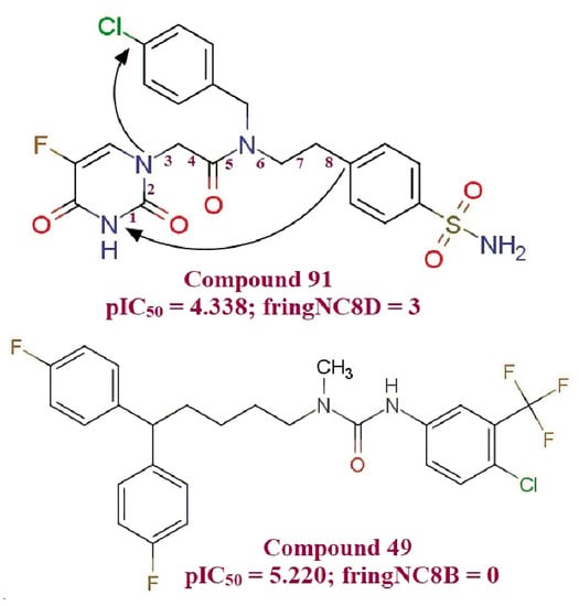fringNC8B (Frequency of occurrence of number of carbon atoms which are present exactly at 8 bonds from ring nitrogen atoms): Compound 49 (IC50 = 6.02 μM) with no such carbon atoms which are present exactly at eight bonds from the ring nitrogen atom found to be about eight-fold more potent than compound 91 (IC50 = 40.92 μM), which contain three such carbons (Figure 6). Moreover, all the ten most active compounds of the series show an absence of carbon atoms, which are present eight bonds away from ring nitrogen (fringNC8B = 0). These observations mark the importance of the fringNC8B molecular descriptor.