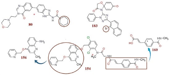 Compound 156 (Practical pIC50 = 4.066, Predicted pIC50 = 5.239 by Model 1.1, Predicted pIC50 = 5.227 by Model 1.2) and compound 160 (Practical pIC50 = 4.658, Predicted pIC50 = 5.604 by Model 1.1 and Predicted pIC50 = 5.664 by Model 1.2) are developed from some of the structural fragments of compound 154 (Figure 7). These fragments retained their molecular features, which helped these compounds to attain enough large values for a few molecular descriptors, with which both the models predicted high pIC50 values for these molecules, but practically, these molecules fall short in a few other molecular features such as length of the molecule, which limited their inhibitory potency and set them in the outliers’ category.