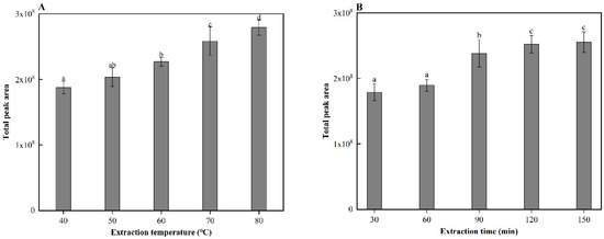 (A) extraction temperatures, and (B) extraction times of solid-phase microextraction (SPME) with corresponding gas chromatography-mass spectrometry (GC-MS) peak areas. Different letters indicate significant differences in values (p < 0.5).