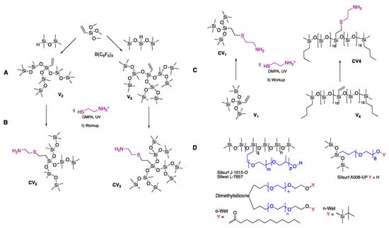 A: Preparation of V2 and V3 hydrophobes by the Piers–Rubinsztajn reaction. B,C: Conversion of these into aminoalkylsilicones CV1–CV4 using cysteamine, as previously reported [1]. D: Structures of commercial silicone surfactants Silwet L-7657, Silsurf J-1015-O, Silsurf A008-UP (Siltech Corp.), and n-Wet, o-Wet (EnRoute Interfaces).
