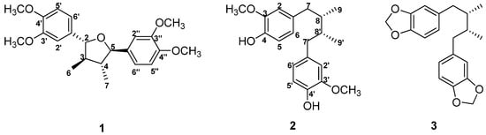 - Shimomura, H.; Sashida, Y.; Oohara, M. Lignans from Machilus thunbergii. Phytochemistry 1987, 26, 1513–1515. [Google Scholar] [CrossRef]