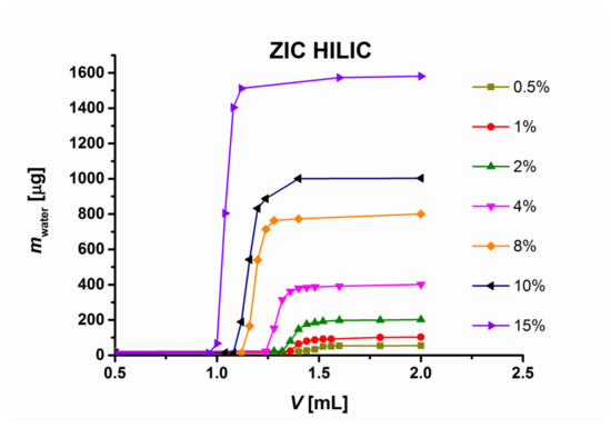 v) aqueous acetonitrile. Maximum water uptake in the acetonitrile with 15% water is observed for zwitterionic stationary phases ZIC HILIC (32%) and ZIC cHILIC (20%), and for TSK-gel Amide 80 (51%) and TSK-gel NH2 (46%).