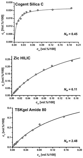 16]. The experimental isotherms of water adsorbed in the inner particle pores in excess of the bulk mobile phase concentration on the columns tested satisfactorily characterizes the Langmuir model, as shown in Equation (7) [