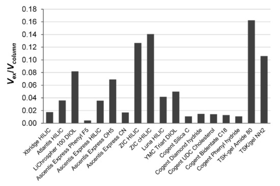 Vex, fills only 2.1% of the pore volume of the Ascentis Express Phenyl FS column, 8.5% of the Ascentis Express CN nitrile column, 1.7% of the Ascentis Express HILIC column and 3.5% of the Ascentis Express OH5 column. In the fully porous silica-based stationary phases containing –OH groups, LiChrospher 100 DIOL, YMC triart DIOL and Luna HILIC, the adsorbed excess water takes 2.4%, 15.1% and 11.3% pore volume, respectively. The hybrid organic-silica Xbridge HILIC and the Atlantis HILIC columns contain 5.3% and 9% adsorbed excess water, respectively, while the pore volume of less polar hydrosilated silica Cogent columns is filled by excess adsorbed water only to 2.7–5.4%. McCalley and Neue [