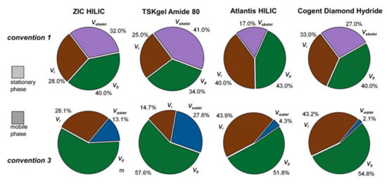 Convention 1 (classical): This is the standard convention used in the traditional determination of the retention factors in LC. The volume of the stationary phase, Vs, is inaccessible to a non-retained marker compound neither retained in nor excluded from the stationary phase. This means that Vs is equal to the empty column inner volume, Vcolumn, minus the total pore volume, VT (the inner pores, Vi, plus the inter-particle pores, V0):Vs = Vcolumn − Vi − V0. In HILIC, a small non-polar hydrocarbon molecule (benzene or toluene) is the most frequent Vm marker.