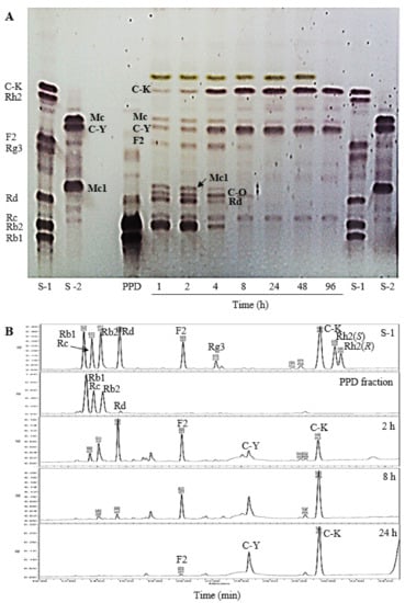 Authentic standards (ginsenosides Rb1, Rb2, Rc, Rd, Rg3, F2, Rh2, C-K, Re and Rg1), PPDG-F and TG-F were kindly provided by the Korea Ginseng Research Institute (Daejeon, Korea). The compositions of Rb1, Rc, Rb2 and Rd in the PPDG-F were 50.8, 21.2, 27.7 and 0.3%, respectively, as peak area in HPLC analysis. Authentic standards of C-Mc1, C-Mc, C-O and C-Y were prepared from ginsenoside Rc or Rb2 using crude enzyme preparation isolated from the mycelial mass of Armillaria mellea according to our previously reported methods [,]. Separately, ginsenoside Rb1, Rc and Rb2 were also isolated from PPDG-F according to a previously reported method []. The isolated compounds were identified by comparison of NMR and Q-TOF-MS data and HPLC retention times with those of authentic standards.
