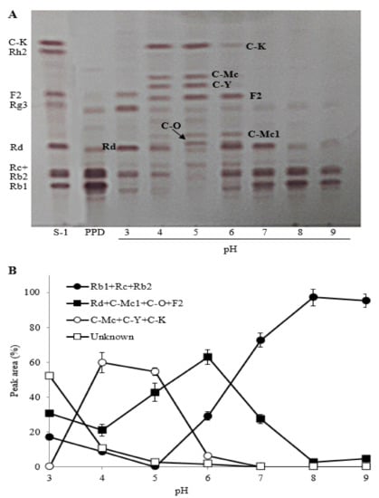 The biotransformation of PPDG-F by FFEP was investigated at a range from pH 3 to 9. The TLC analysis showed that the optimum biotransformation of Rb1, Rc and Rb1 occurred between pH 4 and 5 (Figure 4). Under this pH range, most of the ginsenoside Rb1, Rc and Rb2 were transformed into C-K and C-Y via Rd, F2, C-Mc1 or C-O. PPD-type ginsenosides in acidic buffer solution (pH 3) were hydrolyzed into unknown compounds, which did not match with the Rf values of authentic standards on TLC (Figure 4A). Ginsenosides can be easily deglycosylated and dehydrated at the C-20 position of aglycones when heated under mild acidic condition [,]. When each reaction mixture was investigated by HPLC analysis, most of the parent ginsenosides (Rb1, Rc and Rb2) were biotransformed into minor ginsenosides (C-Mc, C-Y or C-K) between pH 4 and 5, whereas efficient biotransformation could not occur in neutral and alkaline ranges (pH 6–9) (Figure 4B). These results suggest that the biotransformation of PPD-type ginsenosides by FFEP was more desirable at weak acidic condition (pH 4–5) rather than at neutral and basic conditions. Ginsenoside-hydrolyzing enzymes from different microbial sources differ from each other in terms of enzymatic properties and the mode of ginsenoside hydrolysis. Many microbial enzymes showed optimal ginsenoside-hydrolyzing activities at pH 4–5, but neutral β-glycosidases have also been reported from Pythium irregular, Fusobacterium sp. Bacteroides sp. and recombinant β-glucosidase from Microbacterium esteraromaticum, with an optimal pH range of 6.5–7.0 [,].