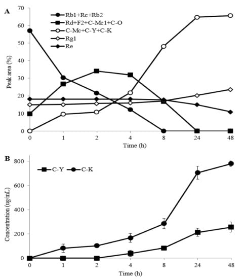 Time course of the biotransformation of total ginsenoside fraction by FFEP. (A) relative peak area percentage (%) of each compound by HPLC analysis; (B) concentrations of C-K and C-Y.