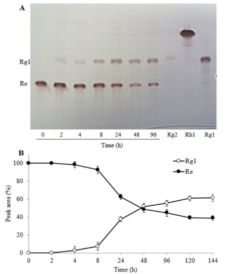 On the other hand, during biotransformation of TG-F by FFEP, ginsenoside Re, one of the major PPT-type ginsenosides, was gradually transformed into ginsenoside Rg1 with increasing reaction time. To verify whether PPT-type ginsenosides Re and Rg1 can be hydrolyzed by FFEP, the reaction mixture of Re or Rg1 with FFEP was taken at regular time intervals during 144 h reaction in acetate buffer solution (pH 4.5) and then was analyzed by TLC and HPLC. Ginsenoside Re was gradually transformed into Rg1 in a time-dependent manner (Figure 6A). When ginsenoside Re was used as a substrate (1 mg/mL), about 50% of ginsenoside Re after 48 h reaction was transformed into Rg1 and 60% was transformed after 144 h (Figure 6B). However, additional biotransformation of ginsenoside Rg1 into Rh1 or F1 was not observed.