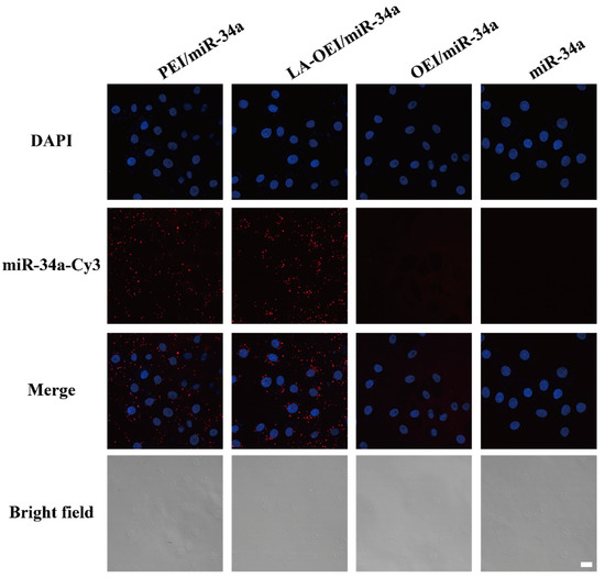 The transfection efficiency analysis of free miR-34a, PEI/miR-34a, LA-OEI/miR-34a and OEI/miR-34a nanoparticles in HeLa cells through CLSM images. The scale bar is 20 μm.