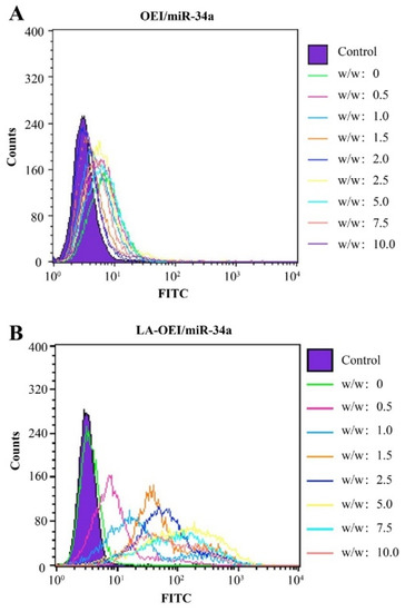 The transfection efficiency of nanoparticles at different mass ratios using FITC-labeled miR-34a. (A) OEI/miR-34a; (B) LA-OEI/miR-34a.
