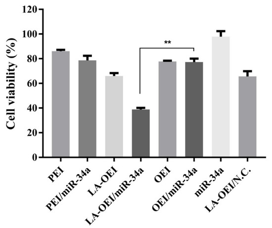 2.2. In Vitro Transfection Efficiency of LA-OEI/miR-34a Nanoparticles